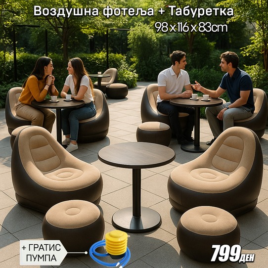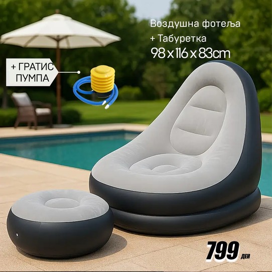 Почувствувајте ја удобноста во секој агол од домот. Идеална за релакс додека гледате телевизија, читате книга или уживате на плажа . Димензии: 98 × 116 × 83 см. Во сетот е вклучена практична пумпа за надувување. Изработена од мек и квалитетен материјал.