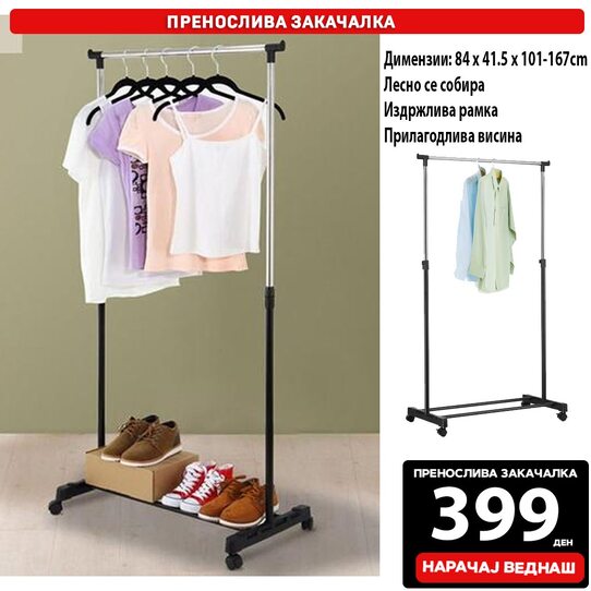 Практична подвижна закачалка за облека каде можете да ја закачите вашата омилена облека и да ви биде на достап во секое време.Поставете ја како додатен простор за закачување облека во вашата спална, детска соба, ходник, претсобје или на било кое друго место во вашиот дом.